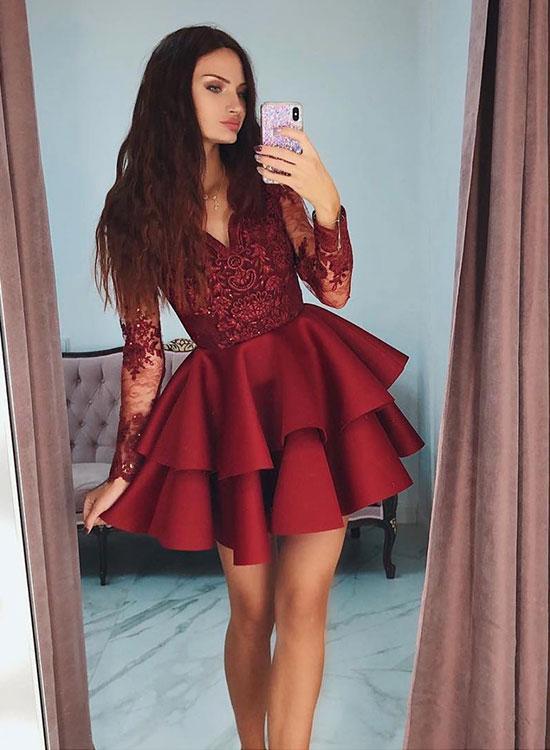 V Neck Long Sleeves Burgundy Lace Prom Dresses, Long Sleeves Burgundy Lace Graduation Evening Dresses