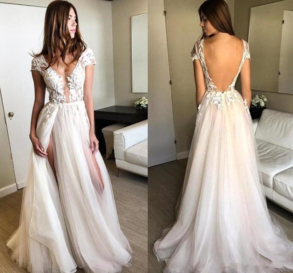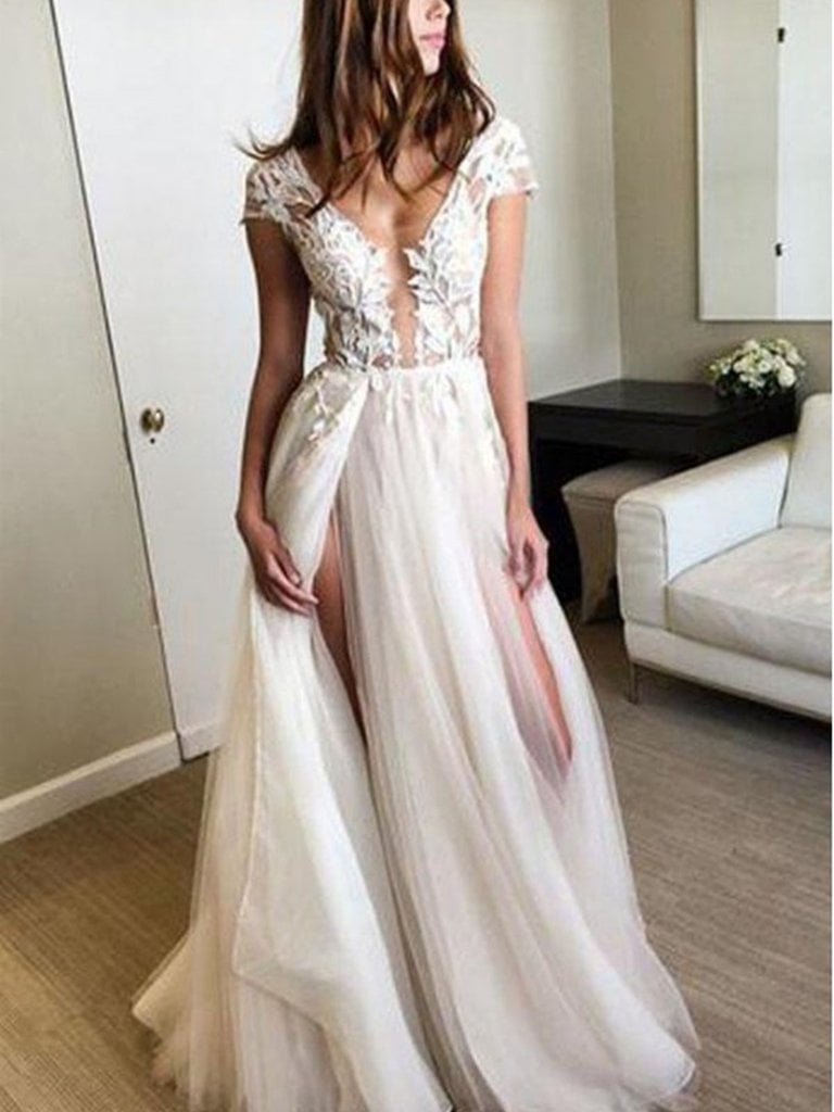 Round Neck Cap Sleeves Backlesss Lace Wedding Dresses, Ivory Backless Lace Prom Dresses Evening Dresses