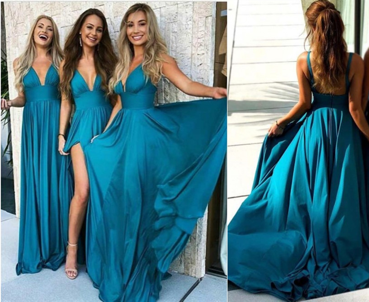 A Line V Neck Blue Prom Dresses, V Neck Blue Bridesmaid Dresses