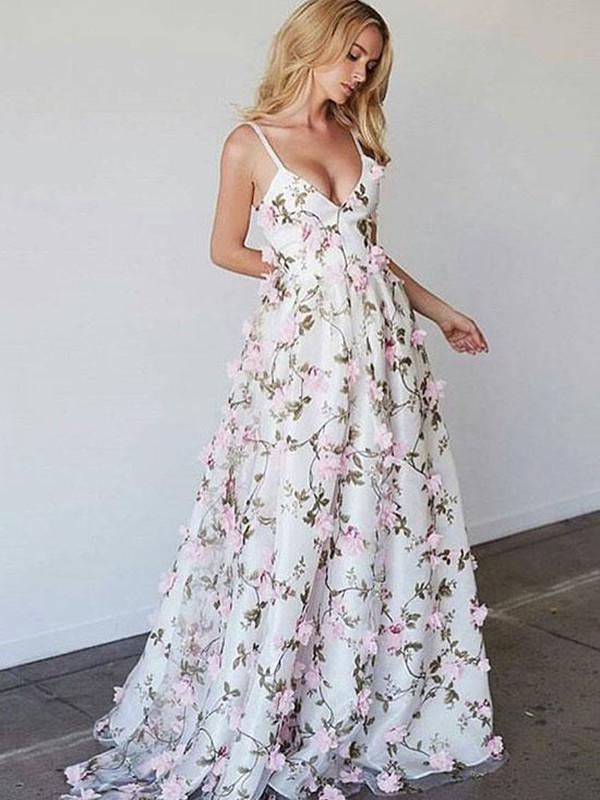3D Flower V Neck Floor Length Prom Dress, V Neck Formal Dress, Graduation Dress