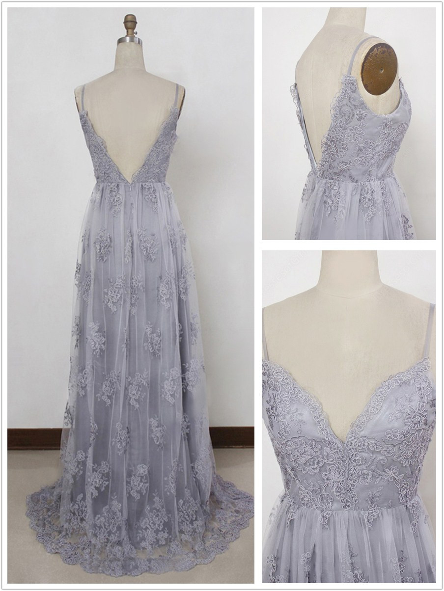 A Line Sweetheart Neck Grey Backless Lace Prom Dress, Grey Lace Formal Dress, Backless Evening Dress