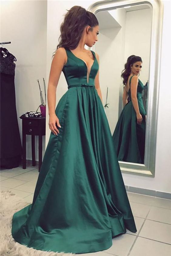 Dark Green V Neck Floor Length Prom Dress, Green Formal Dress, Dark Green Evening Dresses