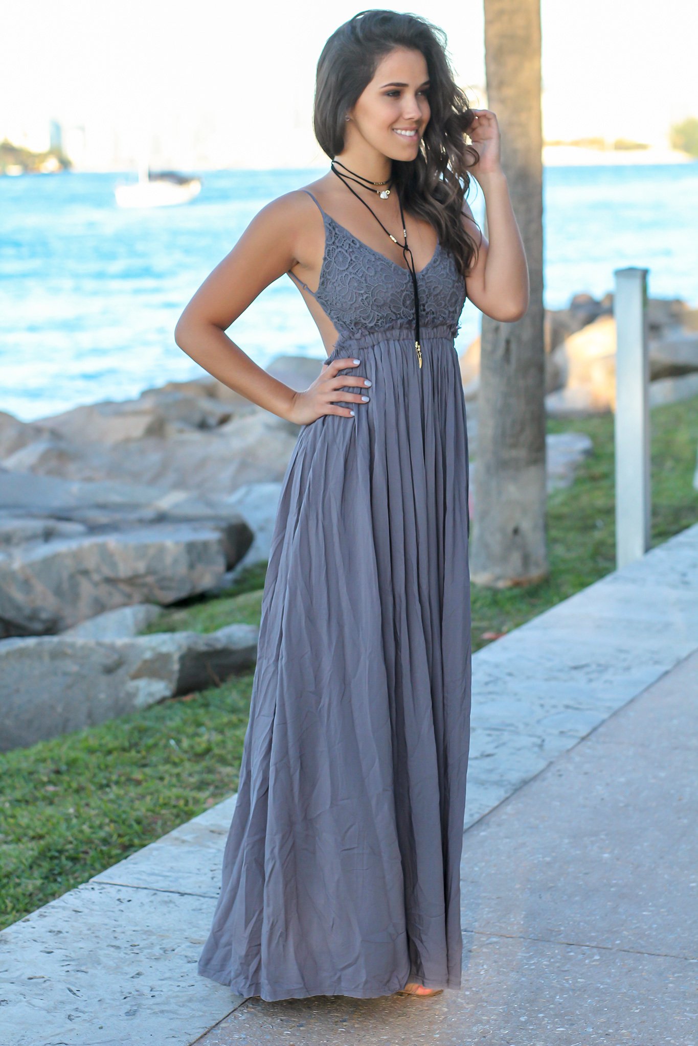 A Line V Neck Backless Gray Lace Prom Dresses, Gray Lace Formal Dresses, Backless Evening Dresses