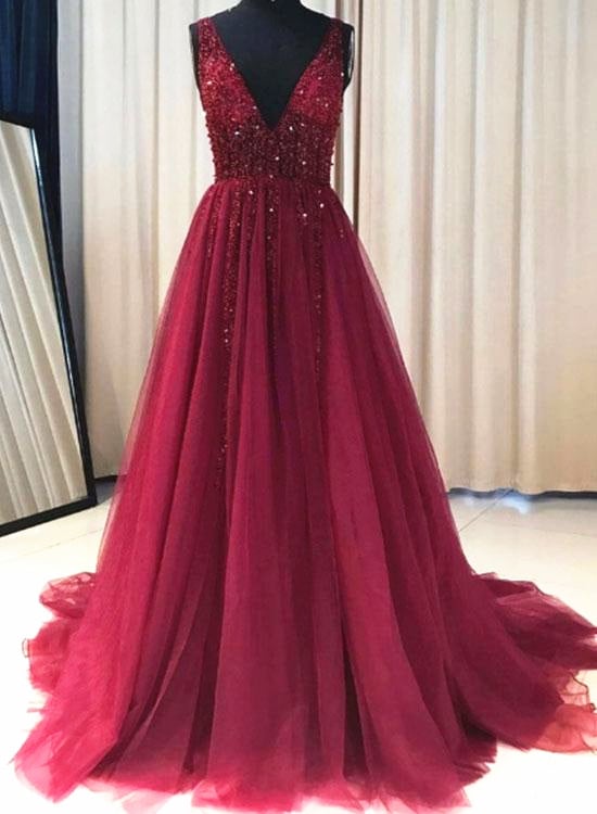 A Line V Neck Burgundy Prom Dresses, Burgundy Formal Dresses, V Neck Evening Dresses