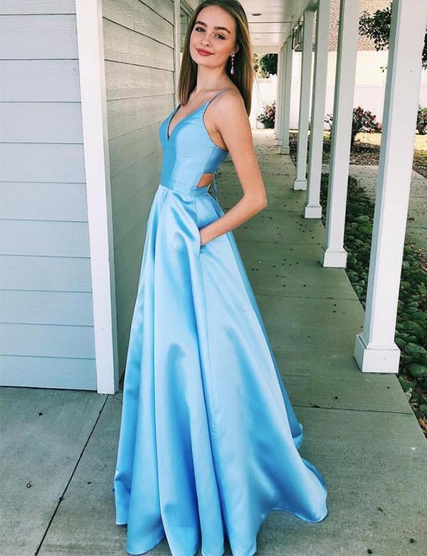 A Line V Neck Light Blue Prom Dresses, Blue Formal Graduation Dresses
