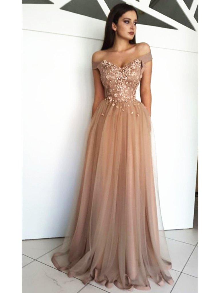 Custom Made A Line Off Shoulder Tulle Lace Prom Dresses, Off Shoulder Formal Dresses, Graduation Dresses
