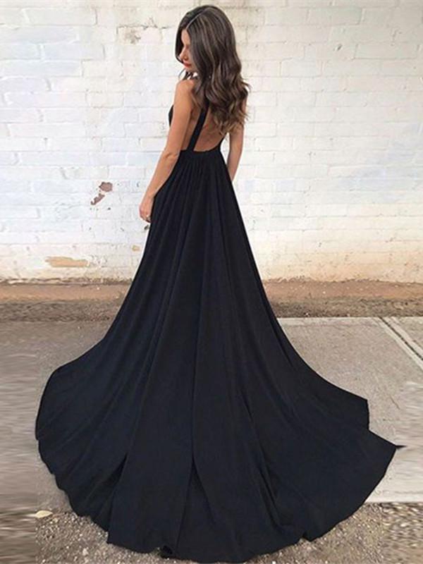 V Neck Black Backless Prom Dress with Train, Black Backless Formal Dress, Graduation Dress