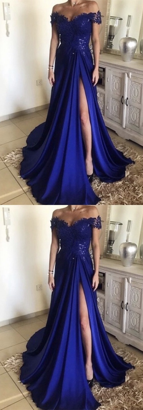 A Line Off Shoulder Royal Blue Lace Prom Dresses, Royal Blue Lace Formal Evening Dresses