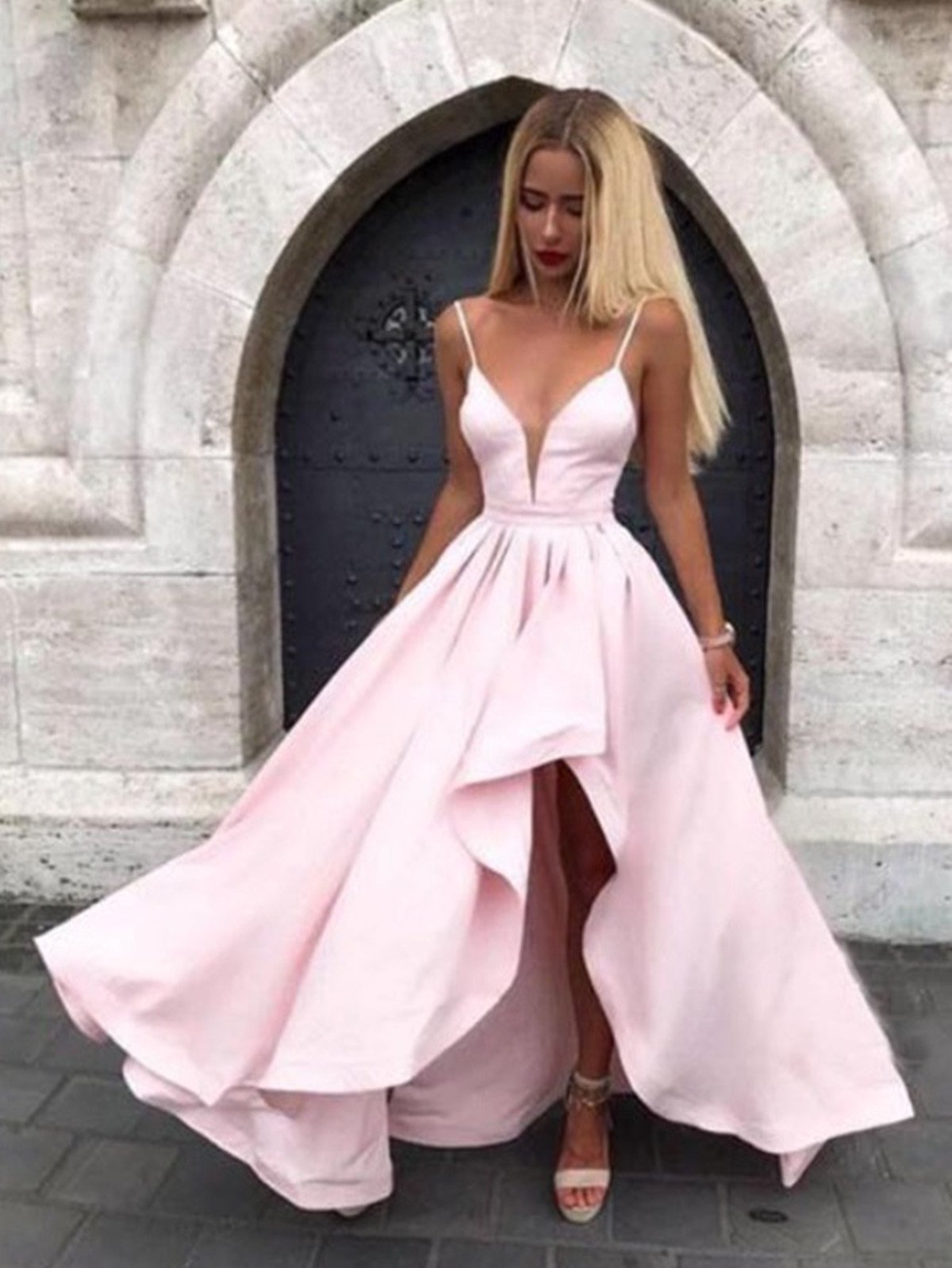 A Line V Neck Pink High Low Prom Dresses, V Neck Pink High Low Formal Graduation Evening Dresses