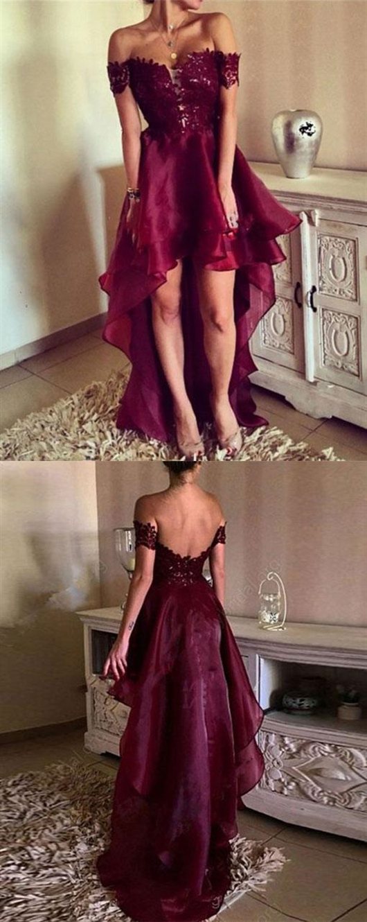 Off Shoulder High Low Organza Backless Maroon Lace Prom Dress, High Low Formal Dress, Maroon Lace Graduation Dress, Maroon High Low Homecoming Dress